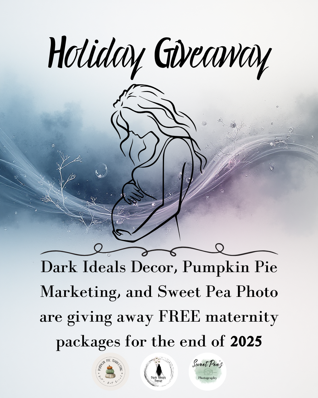 Dark Ideals Decor, Pumpkin Pie Marketing & Events, and Sweet Pea's Photography are thrilled to announce a special giveaway just in time for the holiday season! We understand that expecting mothers can sometimes feel overwhelmed -- especially this season while times are so tough for everyone, so we are offering a unique opportunity to make this journey a little easier and more enjoyable.