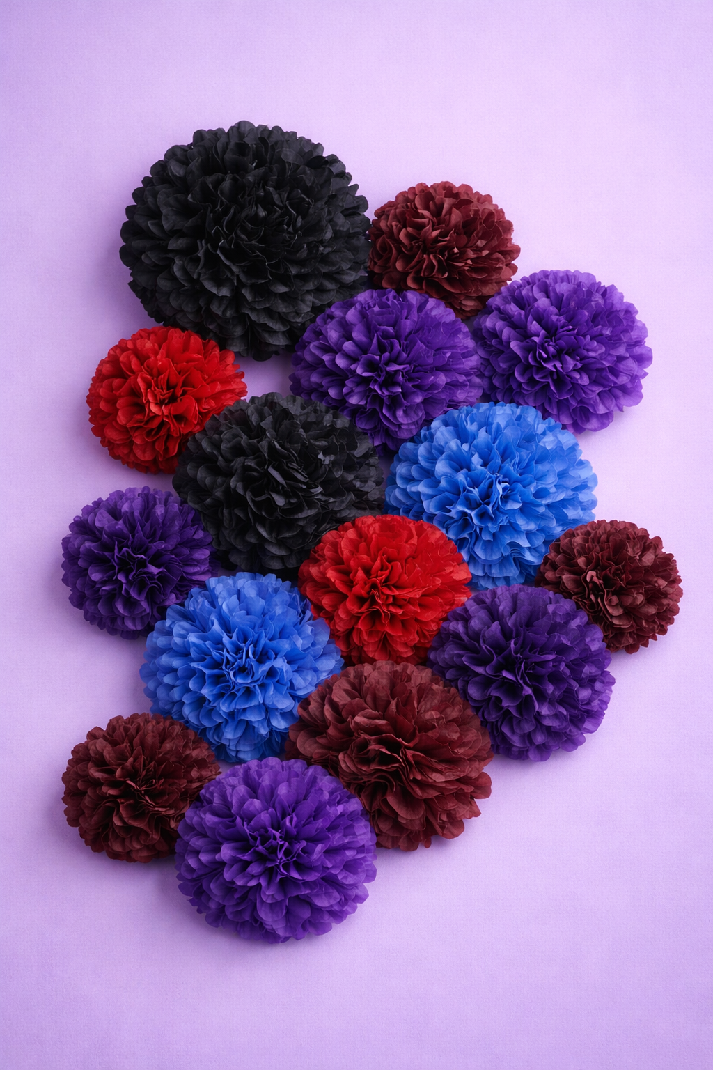This kit leans into dark romance rather than forced sentiment. Each pom is crafted to add volume and texture while maintaining a refined, intentional aesthetic. The color palette is bold but balanced, making it ideal for layered installs, photo backdrops, and statement walls that feel elevated instead of novelty.