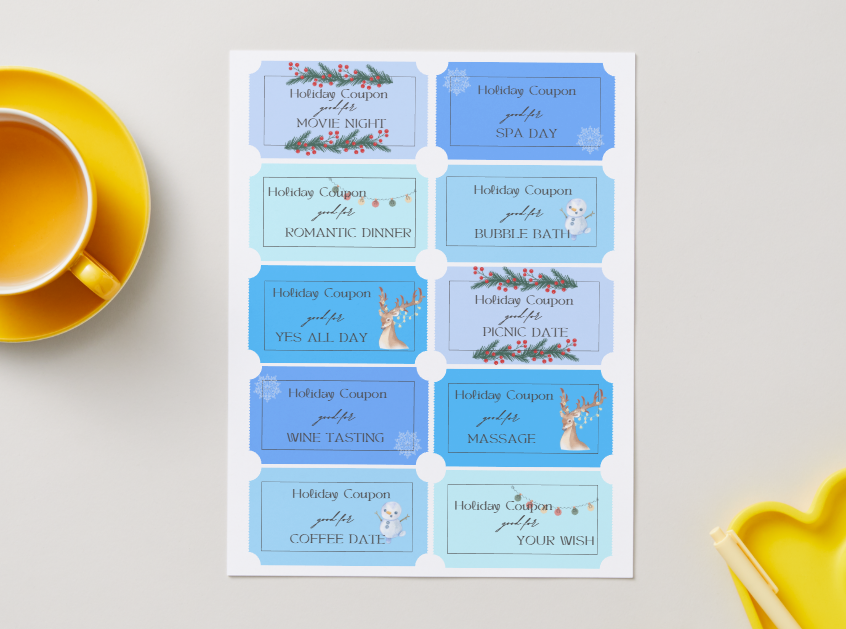Your choice of 50 or 100 personalized holiday coupons. Each coupon is uniquely crafted based on your selected style, theme, and content.