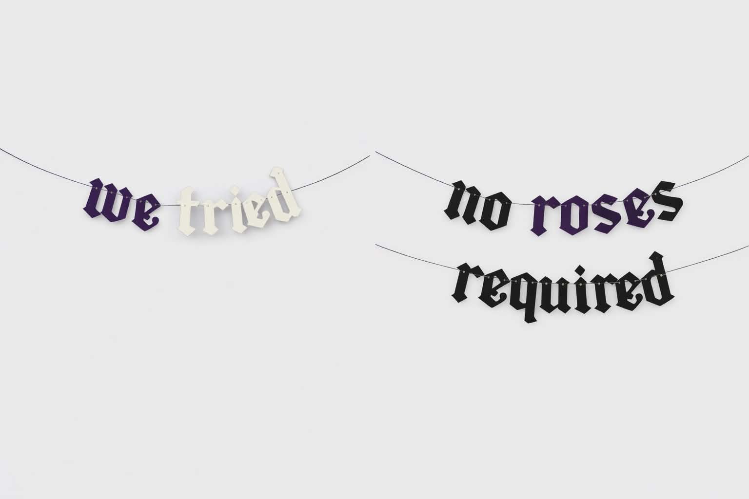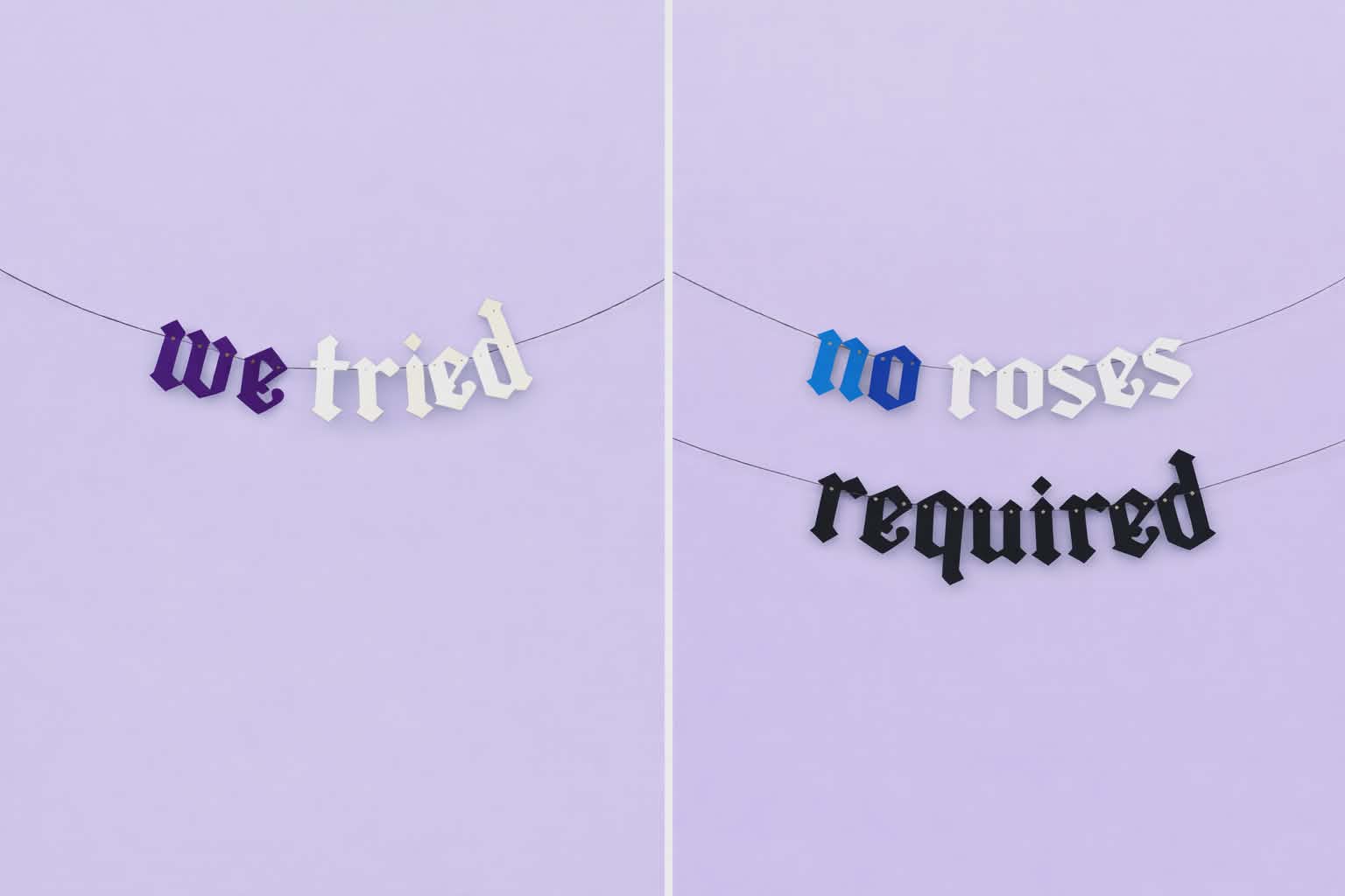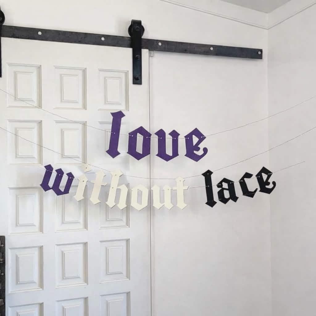 The Love Without Lace™ Phrase Banner is an Anti-Valentine statement for anyone who believes love doesn't need bows, roses, or performative romance. Featuring bold gothic-style lettering and stripped-back composition, this banner is for realism, effort, and honesty over spectacle.